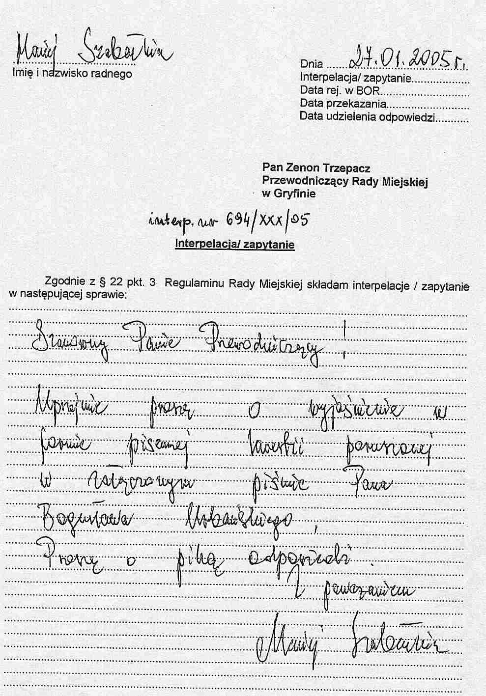 682/XXX/05 - kilka miesięcy temu p. Burmistrz informował oraz prosił media aby pisały o sprawie dotyczącej wyjaśnień związanych z zakupem samochodu Peugeot 607. Powiedział, że osobiście jest zainteresowany wyjaśnieniem sprawy do końca.  Na poprzedniej sesji, przed głosowaniem wniosku o popełnieniu przestępstwa i skierowaniu sprawy do Prokuratury Rejonowej w Gryfinie również publicznie potwierdził, że chce wyjaśnić sprawę do końca. Chciałbym dowiedzieć się, jak mają się publiczne deklaracje Burmistrza do wystąpienia na posiedzeniu Komisji Rewizyjnej w dniu 29 grudnia 2004 r. kiedy to próbował nakłonić Komisję aby nie pisała wniosku do Prokuratury w sprawie oszustw przy przetargu na zakup auta Peugeot 607. W zamian p. Burmistrz zaproponował Komisji Rewizyjnej ukaranie p. Skarbnik Miasta  i Gminy Jolanty Staruk. Jest ona jedną z czterech osób, które podpisały się pod rozstrzygnięciem przetargu o zakupie samochodu z dnia 30 stycznia 2004 r.,  kiedy to gmina była już jego właścicielem dwa tygodnie wcześniej.
