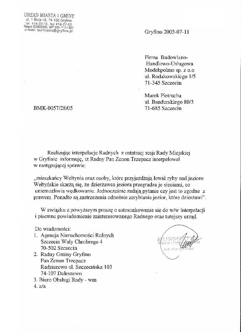 810/XXXVII/05 - mieszkańcy Wełtynia oraz osoby, które przyjeżdżają łowić ryby nad jezioro Wełtyńskie skarżą się, że dzierżawca jeziora przegradza je sieciami, co uniemożliwia wędkowanie. Proszę, aby p. Burmistrz zwrócił się do dzierżawcy z zapytaniem, czy robi to zgodnie z prawem? Ponadto są zastrzeżenia do dzierżawcy odnośnie zarybiania jezior, które dzierżawi. Proszę o zajęcie się sprawą.