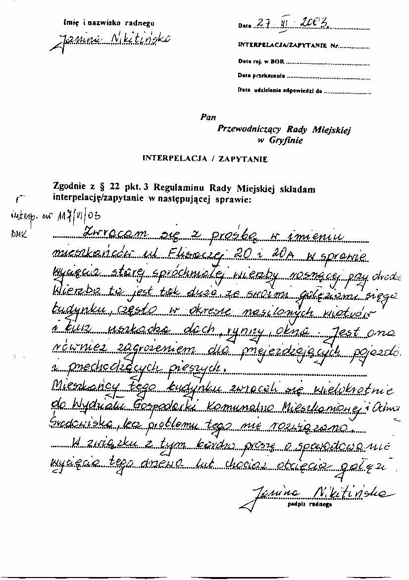 95/VI/03 – apeluję do urzędników naszej gminy aby nazwy ulic pisali pełną nazwą. Szczególnie chodzi mi o ulice, które w swojej nazwie mają imię i nazwisko.