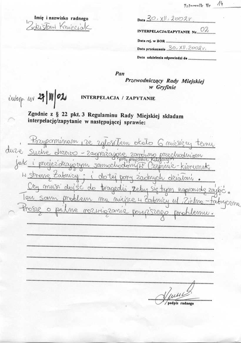 Ad.27/III/02 - jeżeli chodzi o wycięcie suchych drzew, to proszę aby radny ZdzisławKmieciak przyszedł w przyszłym tygodniu do Urzędu Miasta i Gminy. Pojadę razem z p. Kmieciakiem na miejsce i zastanowimy się, co należy zrobić.
