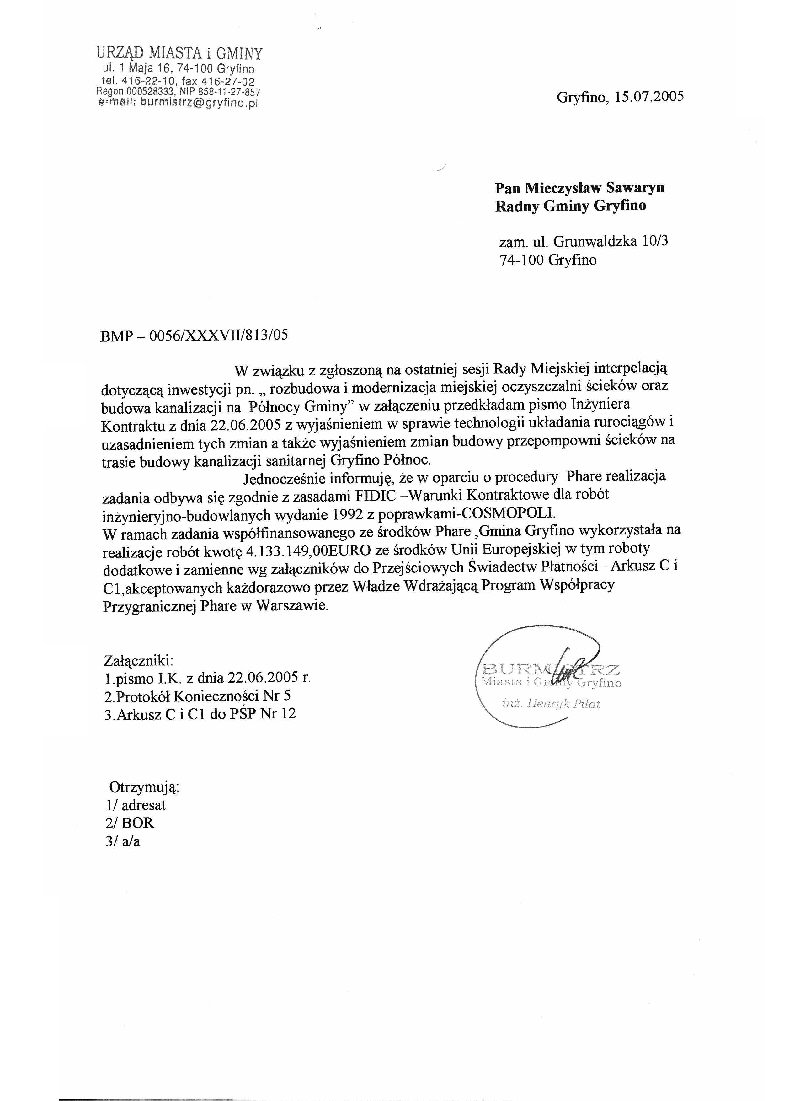 813/XXXVII/05 - kończy się etap związany z budową oczyszczalni ścieków w Gryfinie.Chciałbym dowiedzieć się o kosztach budowy ww. oczyszczalni. Poinformowano nas, że w kosztorysie inwestorskim przewidziano takie inwestycje jak prowadzenie rurociągu metodą odkrywkową. Następnie metodę odkrywkową zmieniono na przeciskową, która jest wielokrotnie tańsza. Czy przed zmianą metody na przeprowadzenie rurociągu wykonano kosztorys różnicowy? Czy zaoszczędzono w ten sposób pieniądze, a jeżeli tak, to co się z nimi stało? Przy tej budowie przewidziano również budowę ośmiu napowietrznych stacji przepompowych, a wybudowano trzy. Czy również w tym przypadku wykonano kosztorys różnicowy? Jeżeli tak, to ile zaoszczędzono pieniędzy? Dlaczego w pięciu przypadkach zmieniono metodę na pompy głębinowe? Proszę o udzielenie informacji, czy rozliczono już wszystkie pracezwiązane z rozbudową oczyszczalni ścieków, ile zaoszczędzono środków finansowych i jaką kwotę z tego tytułu zwrócono dobudżetu gminy? Czy na bazie oszczędności wykonano więcej inwestycji na oczyszczalni ścieków?