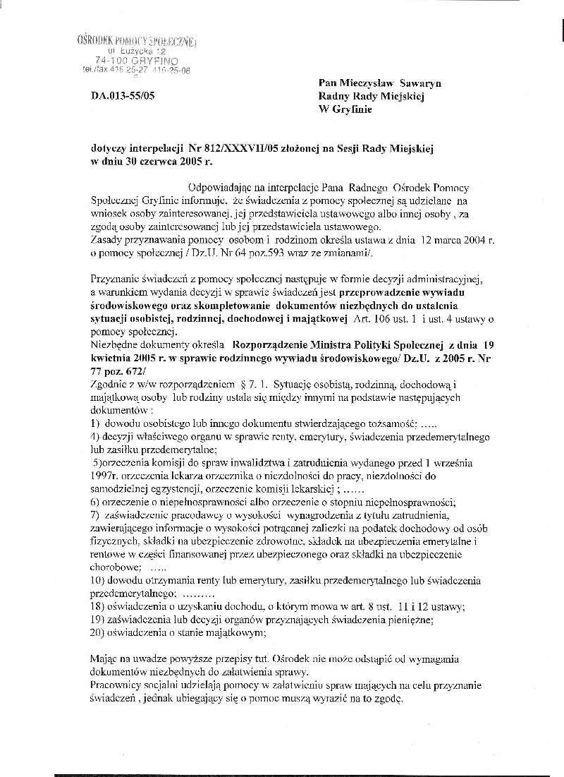812/XXXVII/05 - w Gryfinie jest rodzina, która ma niepełnosprawne, ciężko chore dziecko. W ostatnim czasie następne dziecko z tej rodziny, córka miała wypadek. Przez kilka miesięcy leżała w szpitalu, ale do dnia dzisiejszego nie odzyskała przytomności. Obecnie przebywa w domu. Matka, była pracownica OPS opiekuje się dwójka ciężko chorych dzieci. Brakuje im środków do życie i dlatego zgłosiła się po pomoc do OPS. Ośrodek Pomocy Społecznej zażądał od tej pani bardzo dużo różnych dokumentów, zaświadczeń, itp. Osoba opiekująca się dwójką bardzo ciężko chorych dzieci nie jest w stanie sama zebrać potrzebne dokumenty. Proszę o podjęcie działań mających na celu ułatwienie osobom będącym w trudnej sytuacji finansowej opieki nad rodziną.