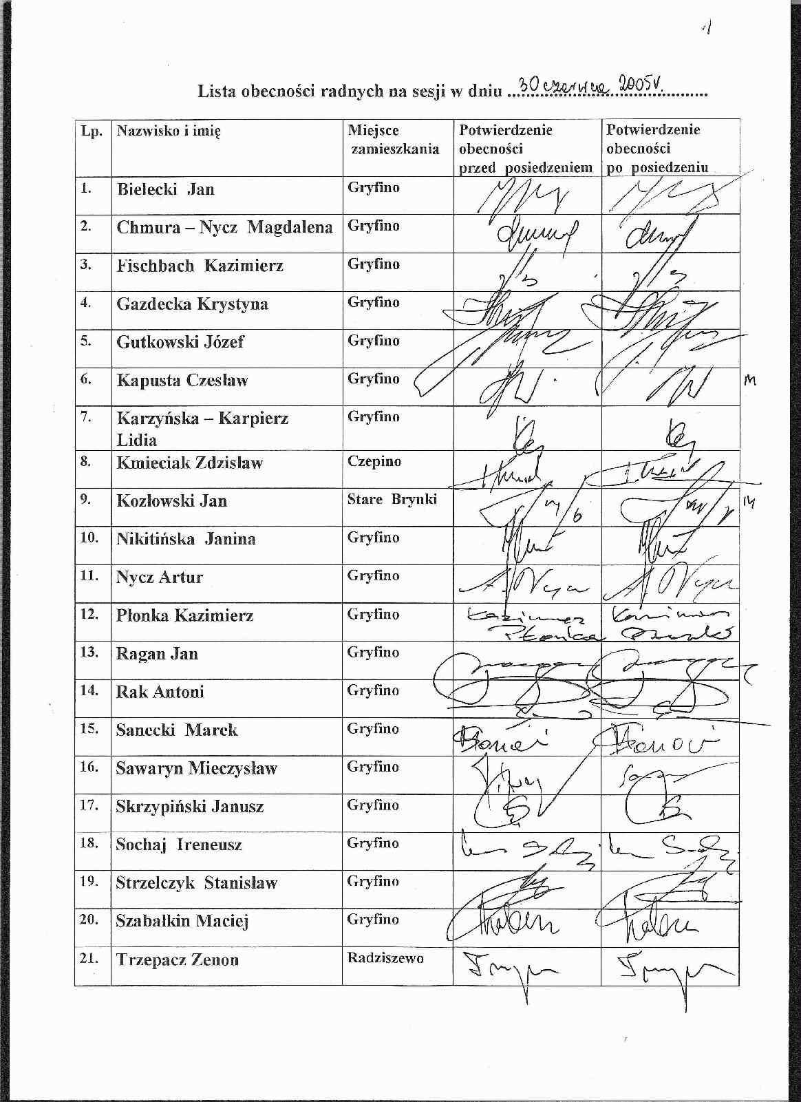 W wyniku jawnego głosowania, na stan Rady 21 i obecnych na sesji 20 radnych, w głosowaniu wzięło udział 20 radnych. Za przyjęciem projektu uchwały głosowało 20 radnych. Głosów przeciwnych, ani wstrzymującym się nie było. Wiceprzewodniczący Rady stwierdził, że uchwałę w sprawie zmiany Uchwały Nr XXIX/445/05 Rady Miejskiej w Gryfinie w sprawie zasad przyznawania i wysokości nagród przyznawanych przez Burmistrza Miasta i Gminy Gryfino dla zawodników osiągających wysokie wyniki we współzawodnictwie międzynarodowym i krajowym przyjęto jednogłośnie. UCHWAŁA NR XXXVII/483/05 stanowi załącznik nr 31.