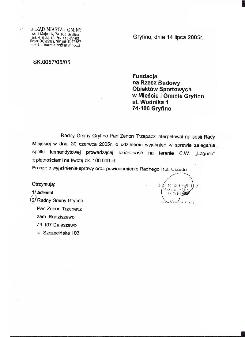 815/XXXVII/05 - dotarły do mnie informacje, że spółka komandytowa prowadząca działalność na terenie Centrum Wodnego "Laguna" zalega z płatnościami na kwotę około 100.000 zł. Proszę o wyjaśnienie sprawy i przedstawienie mi pełnej informacji.