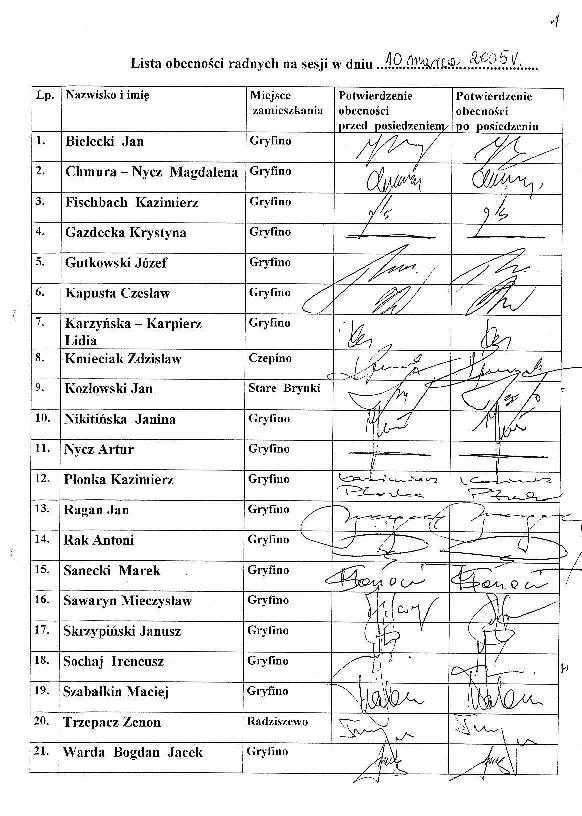 W wyniku jawnego głosowania, na stan Rady 21 i obecnych na sesji 19 radnych, w głosowaniu wzięło udział 19 radnych. Za przyjęciem projektu uchwały głosowało 19 radnych. Głosów przeciwnych, ani wstrzymujących się nie było. Przewodniczący Rady stwierdził, że uchwałę w sprawie przystąpienia do sporządzenia zmiany miejscowego planu zagospodarowania przestrzennego miasta i gminy Gryfino obejmującego obszar trasy napowietrznej linii energetycznej 110 kV od Elektrowni Dolna Odra do Chlebowa przyjęto jednogłośnie. Uchwała NR XXXII/437/05 stanowi załącznik nr 8.