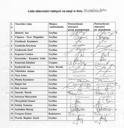 W wyniku jawnego głosowania, na stan Rady 21 i obecnych na sesji 17 radnych, w głosowaniu wzięło udział 16 radnych. Za przyjęciem projektu uchwały głosowało 16 radnych. Głosów przeciwnych, ani wstrzymujących się nie było. Przewodniczący Rady stwierdził, że uchwałę w sprawie zmiany budżetu gminy na 2004 r. oraz zmiany Uchwały Nr XXIII/314/04 Rady Miejskiej w Gryfinie z dnia 22 czerwca 2004 r. w sprawie zmiany budżetu gminy na 2004 r przyjęto jednogłośnie. Uchwała Nr XXVI/366/04 stanowi załącznik nr 29.