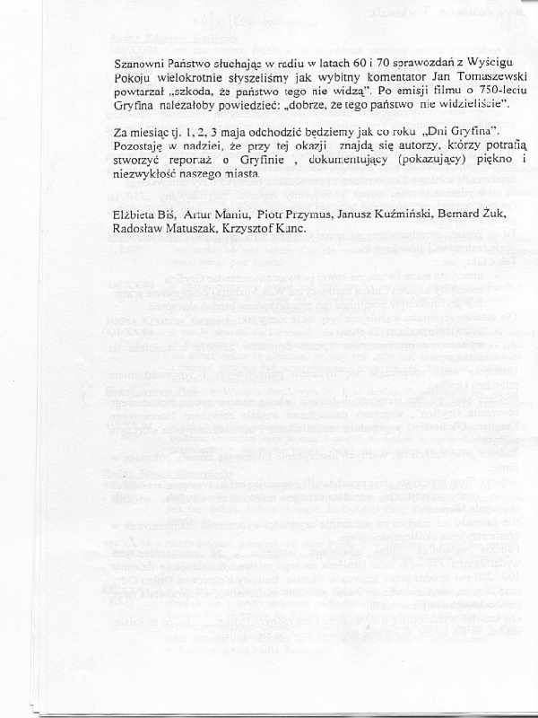 – w Urzędzie Pocztowym Nr 1 w Gryfinie dowiedziałem się, że od 1 kwietnia br. wszystkie wychodzące listy będą stemplowane okolicznościowym datownikiem.