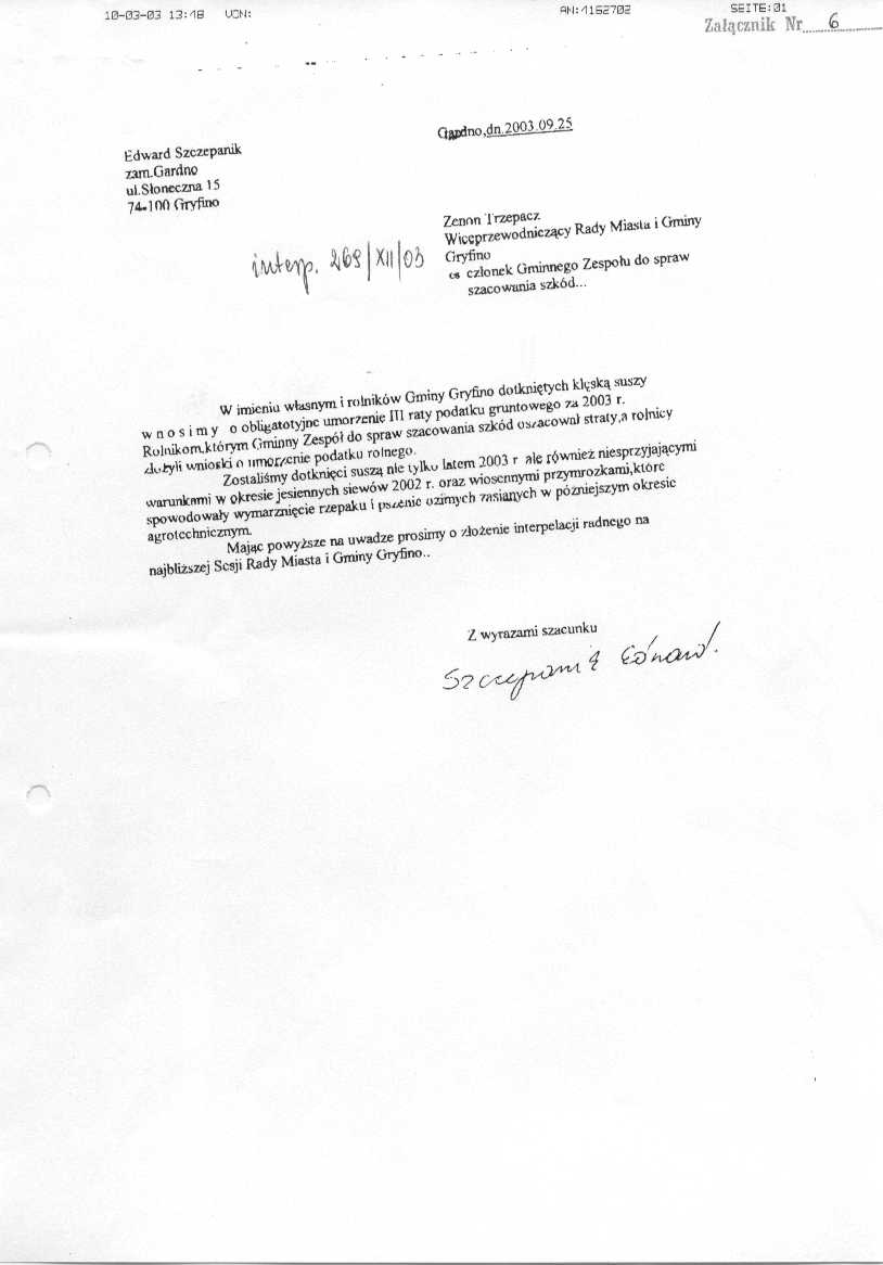 269/XII/03 - w imieniu swoim i rolników z gminy Gryfino zwrócił się do mnie na piśmie p. Edward Szczepanik o obligatoryjne umorzenie III raty podatku rolnego z powodu tegorocznej suszy. Treść pisma w załączeniu,