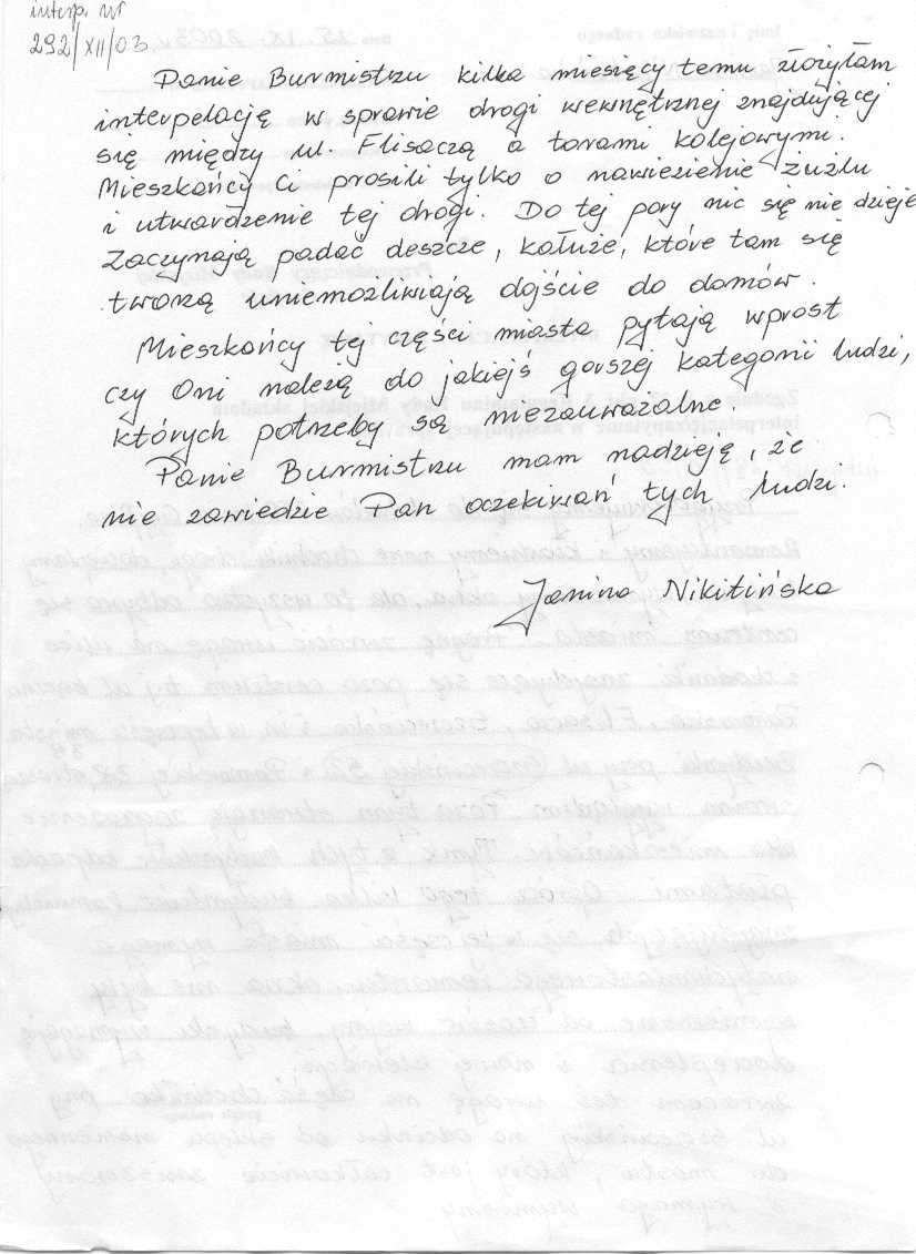292/XII/03 - ponowienie interpelacji w sprawie remontu drogi wewnętrznej między ulicą Flisaczą, a torami kolejowymi. Treść w załączeniu.