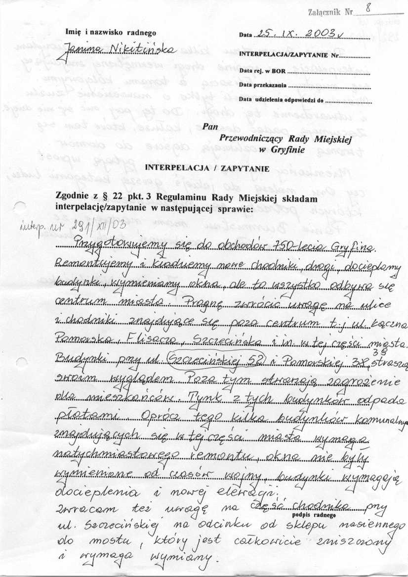 291/XII/03 - interpelacja w sprawie przygotowania do obchodów 750-lecia Gryfina w załączeniu.