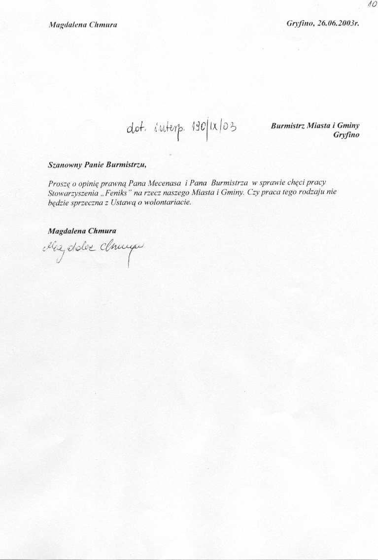 185/IX/03 - rozpoczynają się wakacje. Około 60% młodzieży nie wyjedzie nigdzie na wypoczynek. Proszę Pana Burmistrza o rozważenie możliwości zorganizowania na stadionie przy Centrum Wodnym Laguna w piątki, soboty i niedziele festynów dla mieszkańców miasta i gminy. Należy zorganizować sprzedaż artykułów spożywczych, napojów. Powinna tam również przygrywać kapela. Nie musi tego organizować gmina. Mogą się tym zająć podmioty gospodarcze. Trzeba z nimi omówić sprawę.