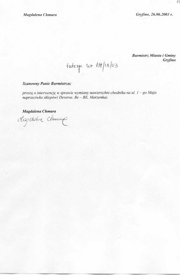 174/IX/03 - należy zamontować sygnalizację świetlną na skrzyżowaniu ulic Zygmunta Krasińskiego, Hugo Kołłątaja i Wojska Polskiego w Gryfinie. Zamontowanie sygnalizacji świetlnej poprawi bezpieczeństwo na skrzyżowaniu drogi. Ponadto należy wyciąć jedno drzewo znajdujące się po prawej stronie drogi jadąc od ulicy Zygmunta Krasińskiego w kierunku ulicy Wojska Polskiego. Rosnące tam drzewo zasłania widoczność na drodze.