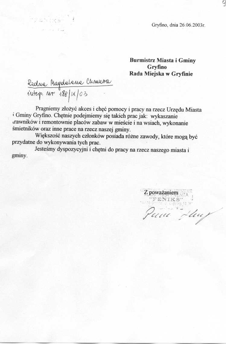 176/IX/03 - przy realizacji wniosku Komisji Spraw Społecznych i Bezpieczeństwa Społecznego dotyczącego ufundowania sztandaru dla Miasta i Gminy Gryfino należy również pomyśleć o ufundowaniu insygniów władzy dla Przewodniczącego Rady i Pana Burmistrza. Należy to zrobić w porozumieniu ze związkiem heraldycznym.