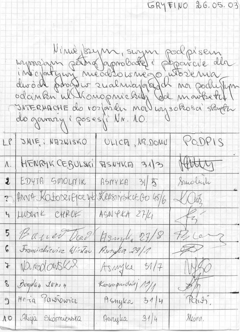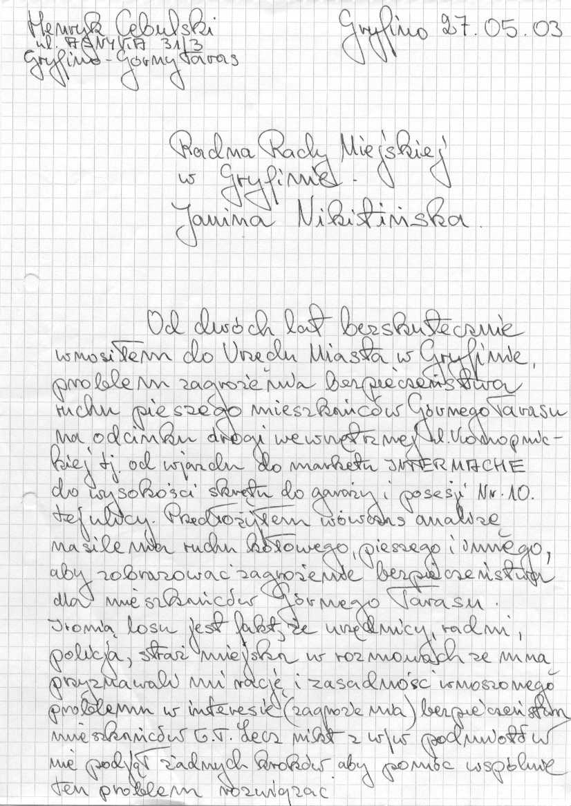 Ad.157/VIII/03 – sprawa zostanie rozwiązana, bo firma GRYF- SPED przenosi się do Pniewa. Szczegółowo zapoznam się ze sprawą i udzielę odpowiedzi na piśmie.
