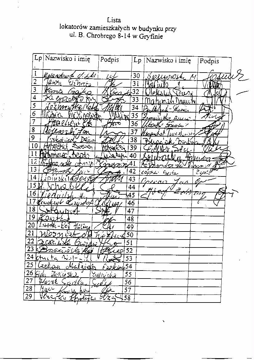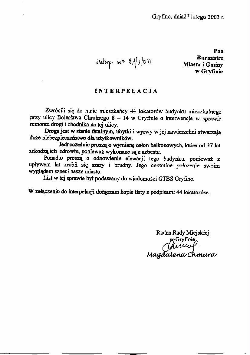 61/V/03 – proszę   Pana   Burmistrza   oraz   Radę   o   podjęcie   działań   mających   na   celu umożliwienie   przyjazdu   do   Polski   Pani   Eugenii   Radomskiej   z   synem   Wiktorem w   ramach   łączenia   rodzin.   Pani   E. Radomska   jest   córką   p. Radomskiego,   który mieszka   już   w   Gryfinie. Proszę   o   pozytywne   załatwienie   sprawy.