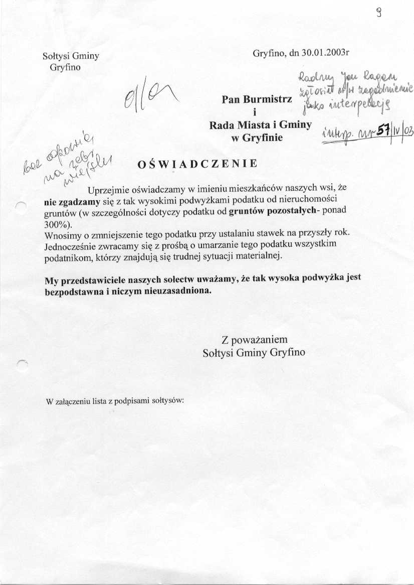 40/IV/03 – w grudniu 2002 roku uchwalone zostały podatki na 2003 rok. Jak to się stało, że podatek od nieruchomości za grunty pozostałe podwyższono aż o 300%? Mieszkańcy naszej gminy są zaniepokojeni taką sytuacją.