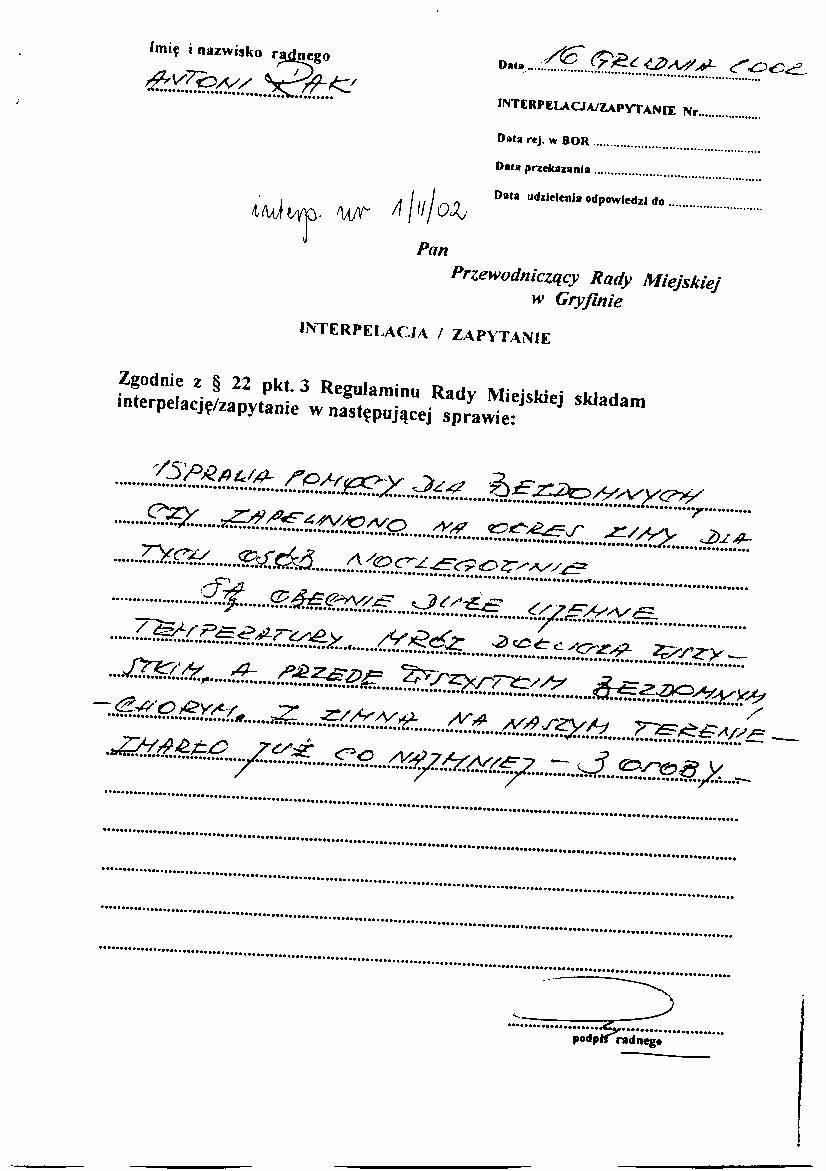 Ad. 1/II/02 - według informacji OPS każdy bezdomny z naszego terenu ma zapewnione miejsce w Domu Opieki Społecznej. Problem zakwaterowania bezdomnych nie polega na braku miejsc. Problemem jest to, że niektórzy bezdomni nie chcą iść do Domu Opieki Społecznej.