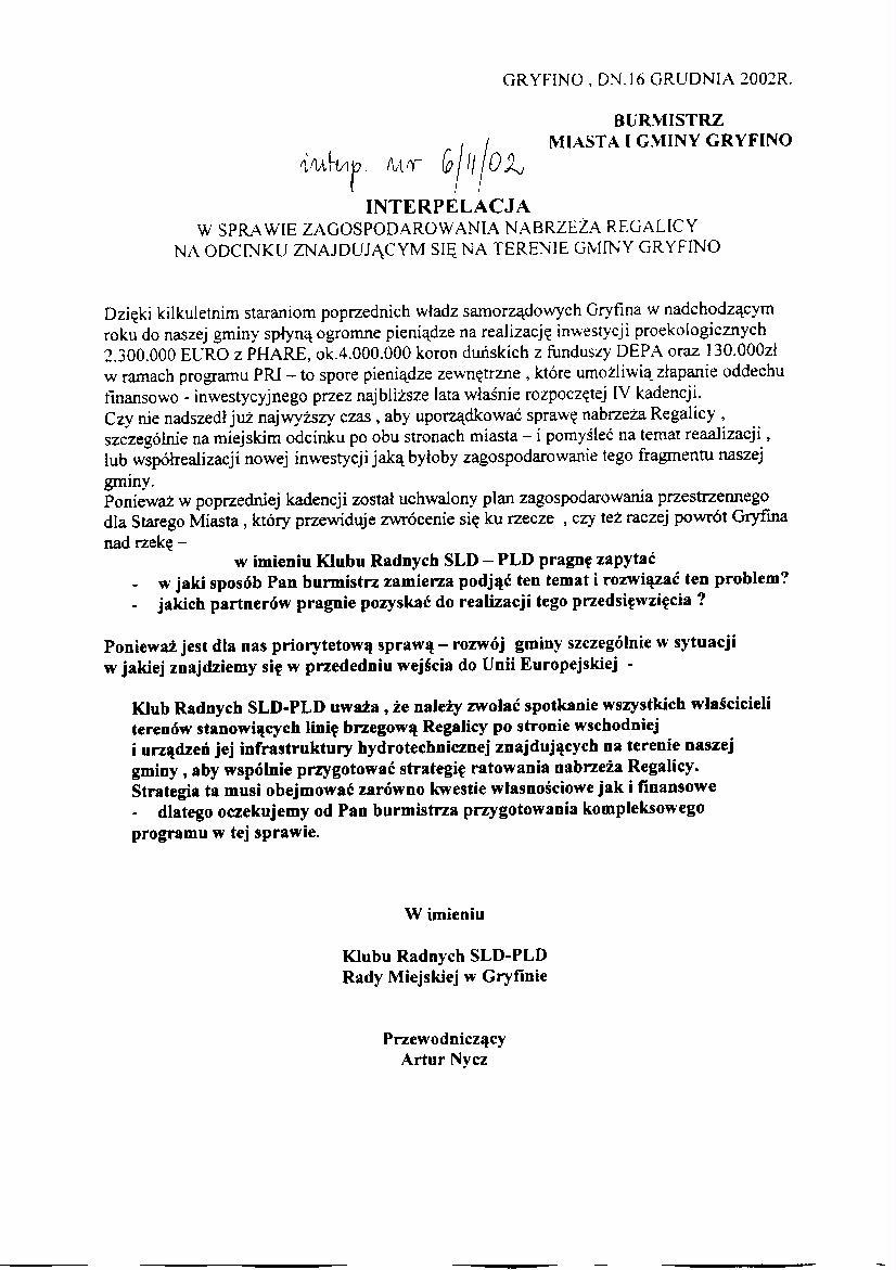 Ad.6/II/02 - w kampanii wyborczej mówiłem, że miasto Gryfino należy zwrócić W stronę rzeki. Ustaliłem, że odcinek nabrzeża od ul. Rapackiego do Nadleśnictwa w Gryfinie jest własnością naszej gminy. W ubiegłym tygodniu spotkałem się w tej sprawie z honorowym konsulem generalnym Niemiec w Szczecinie p. Bartłomiejem Sochańskim. Obecnie opracowywany jest program „Odra” dotyczący zagospodarowania terenu na odcinku od Schwedt do Szczecina. Poinformowałem, że jako gmina jesteśmy tym zainteresowani, bo chcemy zagospodarować nasze nabrzeże. Dziękuję poprzedniemu Zarządowi Miasta i Gminy za to, że zgromadził z Unii duże środki finansowe na rozbudowę oczyszczalni ścieków. Pozyskiwanie takich środków jest czasochłonne. Teraz należy ubiegać się o środki finansowe na lata 2003 - 2004. Podejmę takie działania. Przygotowuję nową strukturę urzędu. W naszej gminie powstanie wydział, który będzie zajmował się pozyskiwaniem środków z Unii, utrzymywaniem stosunków międzynarodowych oraz w realny sposób informował mieszkańców naszej gminy o Unii Europejskiej. Chodzi o to, by w czasie trwania referendum w w/w sprawie mieszkańcy gminy mogli odpowiedzialnie oddać swój głos.