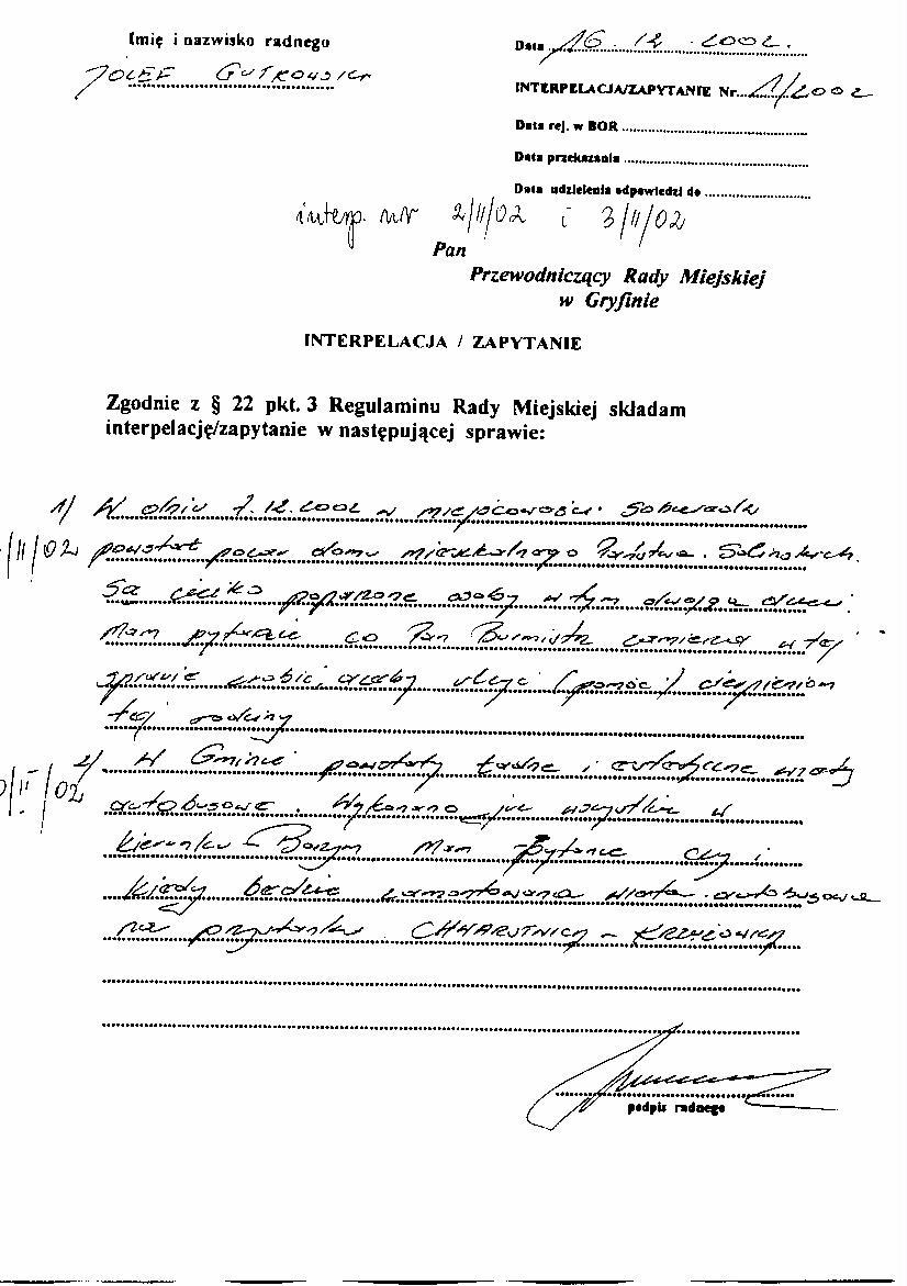 Ad. 3/II/02 - po zatwierdzeniu przez Radę budżetu gminy na 2003 rok udzielę odpowiedzi na interpelacje, których realizacja wymaga nakładów finansowych. Po zatwierdzeniu budżetu będę wiedział jakie są możliwości na realizację poszczególnych zadań.
