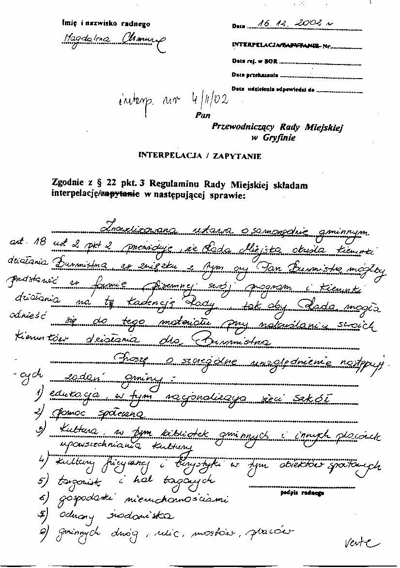Ad. 4/II/02 - jako radna powinna Pani Chmura wiedzieć, że kierunki działania Burmistrza określa zatwierdzony przez Radę budżet oraz uchwalona przez Radę Strategia Rozwoju Miasta i Gminy. Myślę, że po okresie trzech miesięcy urzędowania będę mógł przedstawić propozycje zmian do w/w Strategii.