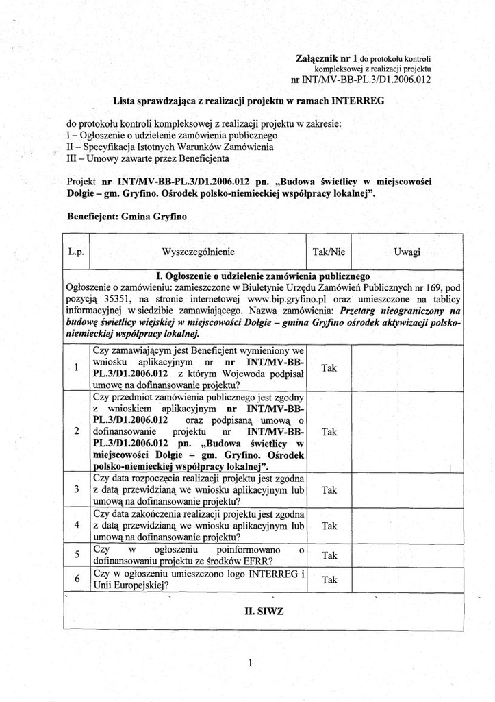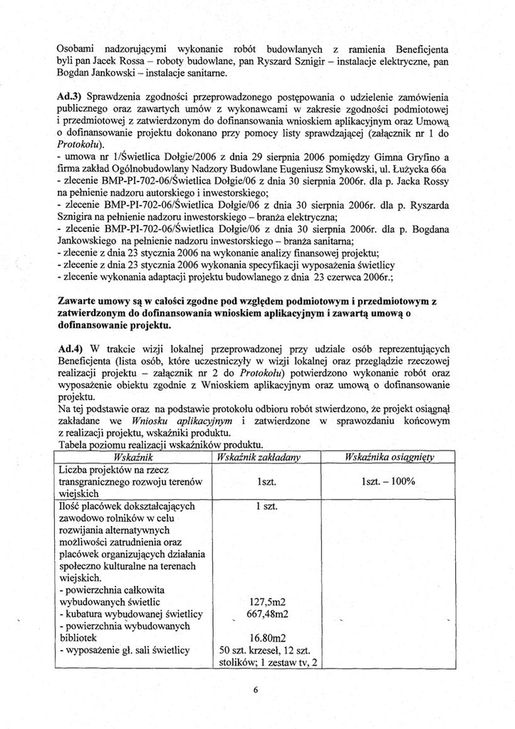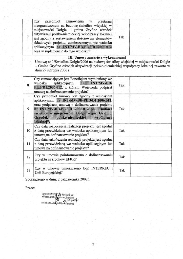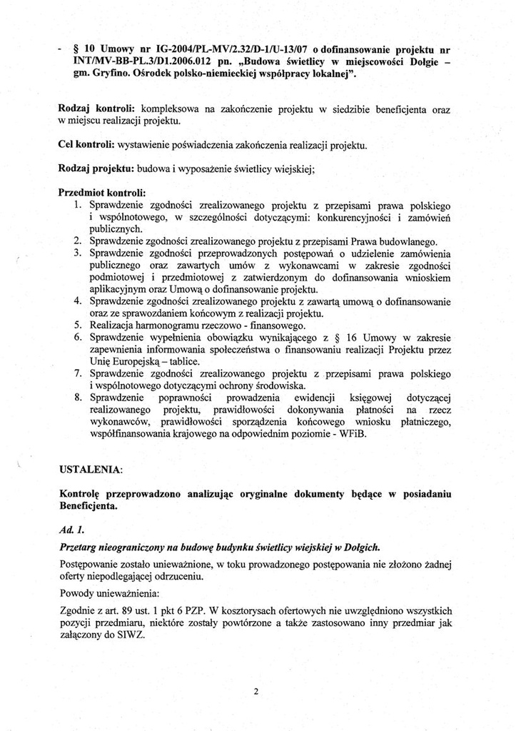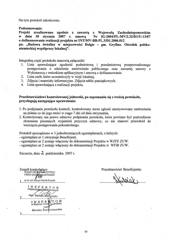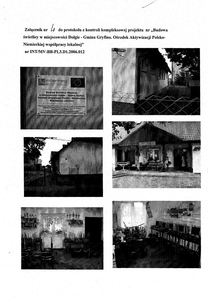 Informacja pokontrolna z kontroli kompleksowej realizacji projektu nr INT/MV-BB-PL.3/D1.2006.012 pn. „Budowa świetlicy w miejscowości Dołgie – Gm. Gryfino. Ośrodek polsko – niemieckiej współpracy lokalnej”.
