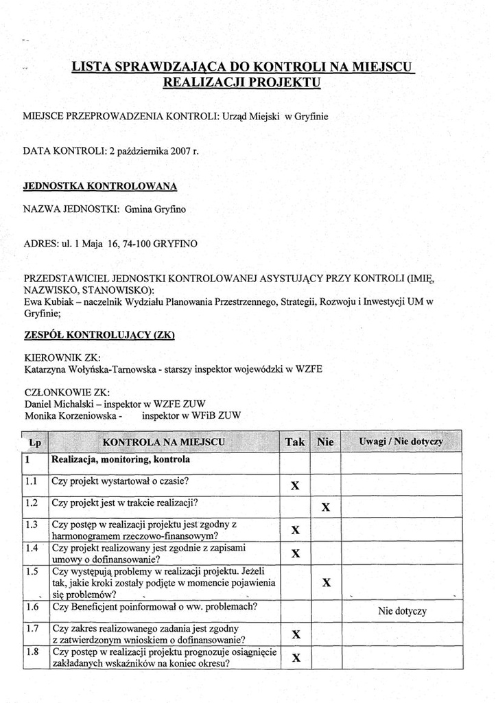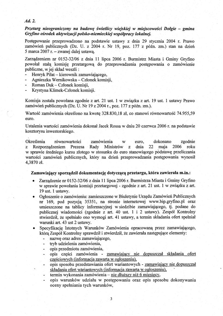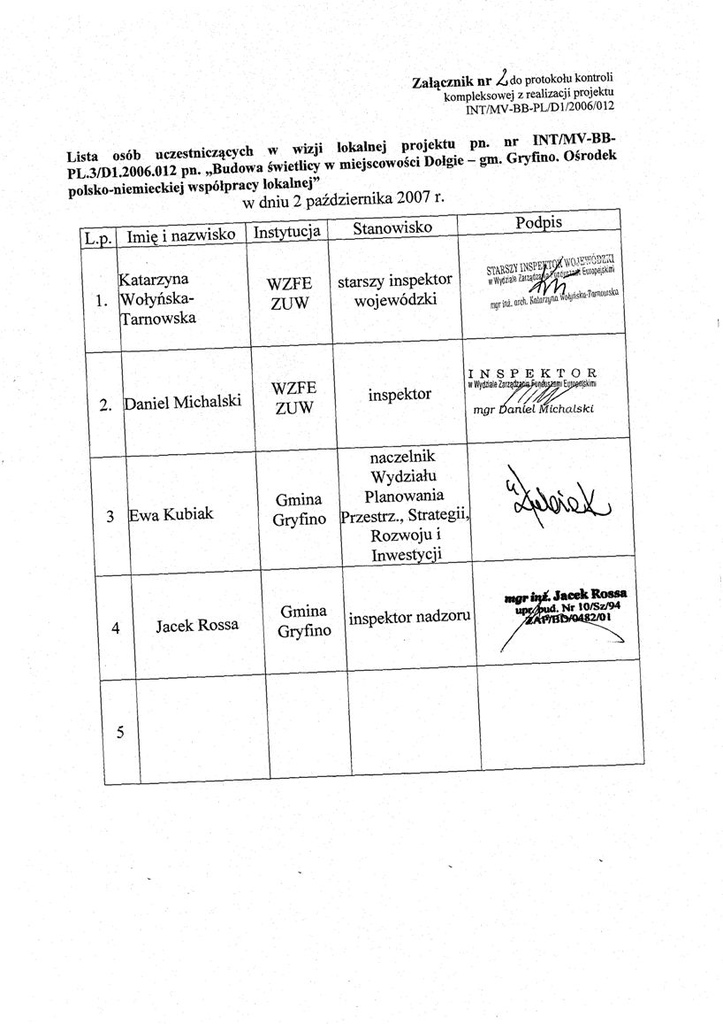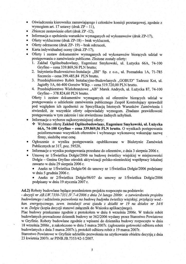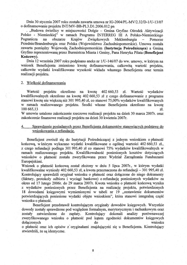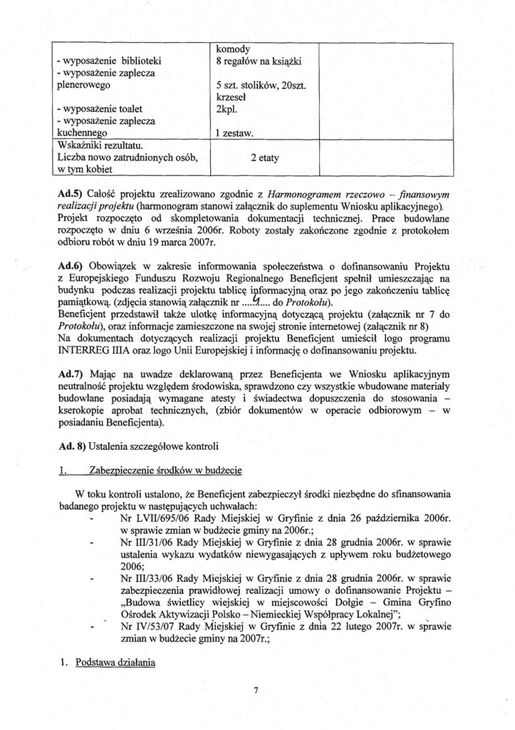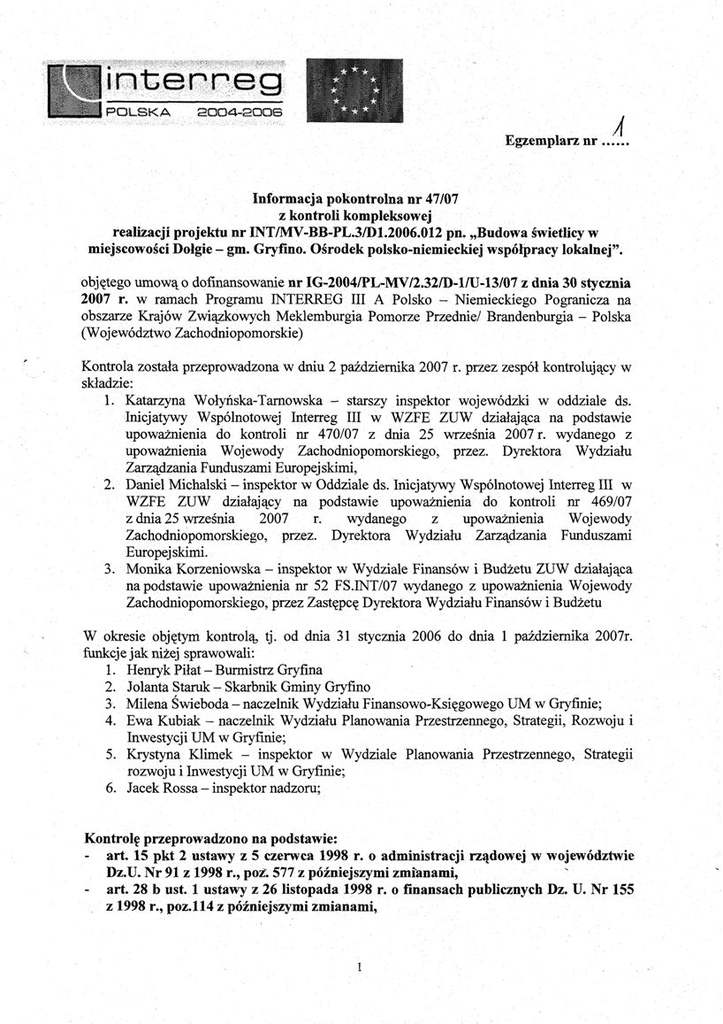 Informacja pokontrolna z kontroli kompleksowej realizacji projektu nr INT/MV-BB-PL.3/D1.2006.012 pn. „Budowa świetlicy w miejscowości Dołgie – Gm. Gryfino. Ośrodek polsko – niemieckiej współpracy lokalnej”.
