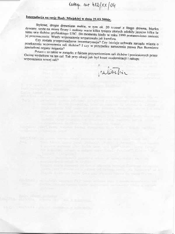413/XX/04 - w gazecie „Nowe 7 Dni Gryfina” z dnia 24 marca 2004r. ukazał się artykuł, pt. „Pół miasta wiedziało”. W artykule tym była Skarbnik Urzędu Miasta  i Gminy powołując się na p. Franciszka Zawieruchy zarzuca mu, iż wręcz  zabronił byłemu Burmistrzowi interweniować w sprawy PUK. Jest to nieprawda. Na każde posiedzeniu Komisji Rolnictwa, Handlu Usług i Inicjatyw  Gospodarczych zapraszaliśmy przedstawicieli PUK oraz p. Ochmańską i domagaliśmy się informacji w sprawie PUK. Nigdy nie otrzymaliśmy wyczerpujących informacji. Nie można z człowieka robić ofiary tylko dlatego, że nie ma się jak bronić.  Proszę Przewodniczącego Rady by zajął stanowisko w tej sprawie. Dlaczego nic nie robiła w sprawie osoba delegowana do pracy  w Zarządzie PUK?. To właśnie ta osoba powinna ponieść konsekwencje za zatajenie prawdy. Dziwię się redaktorom gazety, że nie zapytali drugiej strony, co ma do powiedzenia w sprawie. Nie można krzywdzić człowieka, który wiele dobrego zrobił dla Gryfina.