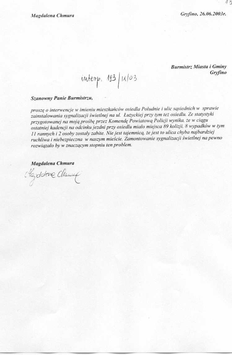 174/IX/03 - należy zamontować sygnalizację świetlną na skrzyżowaniu ulic Zygmunta Krasińskiego, Hugo Kołłątaja i Wojska Polskiego w Gryfinie. Zamontowanie sygnalizacji świetlnej poprawi bezpieczeństwo na skrzyżowaniu drogi. Ponadto należy wyciąć jedno drzewo znajdujące się po prawej stronie drogi jadąc od ulicy Zygmunta Krasińskiego w kierunku ulicy Wojska Polskiego. Rosnące tam drzewo zasłania widoczność na drodze.