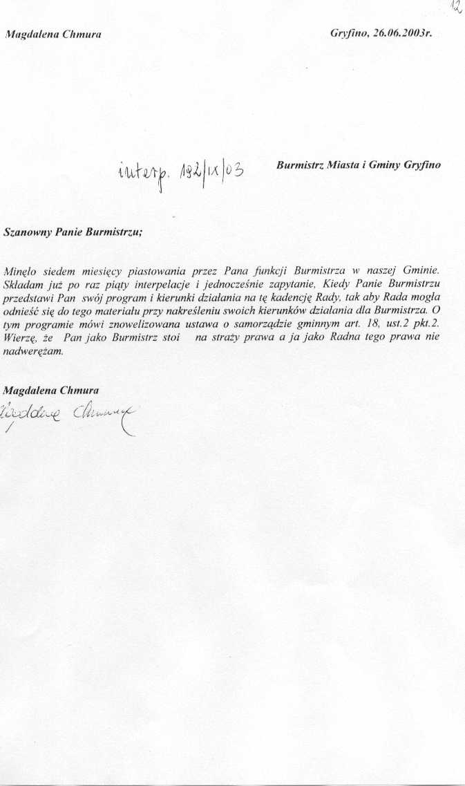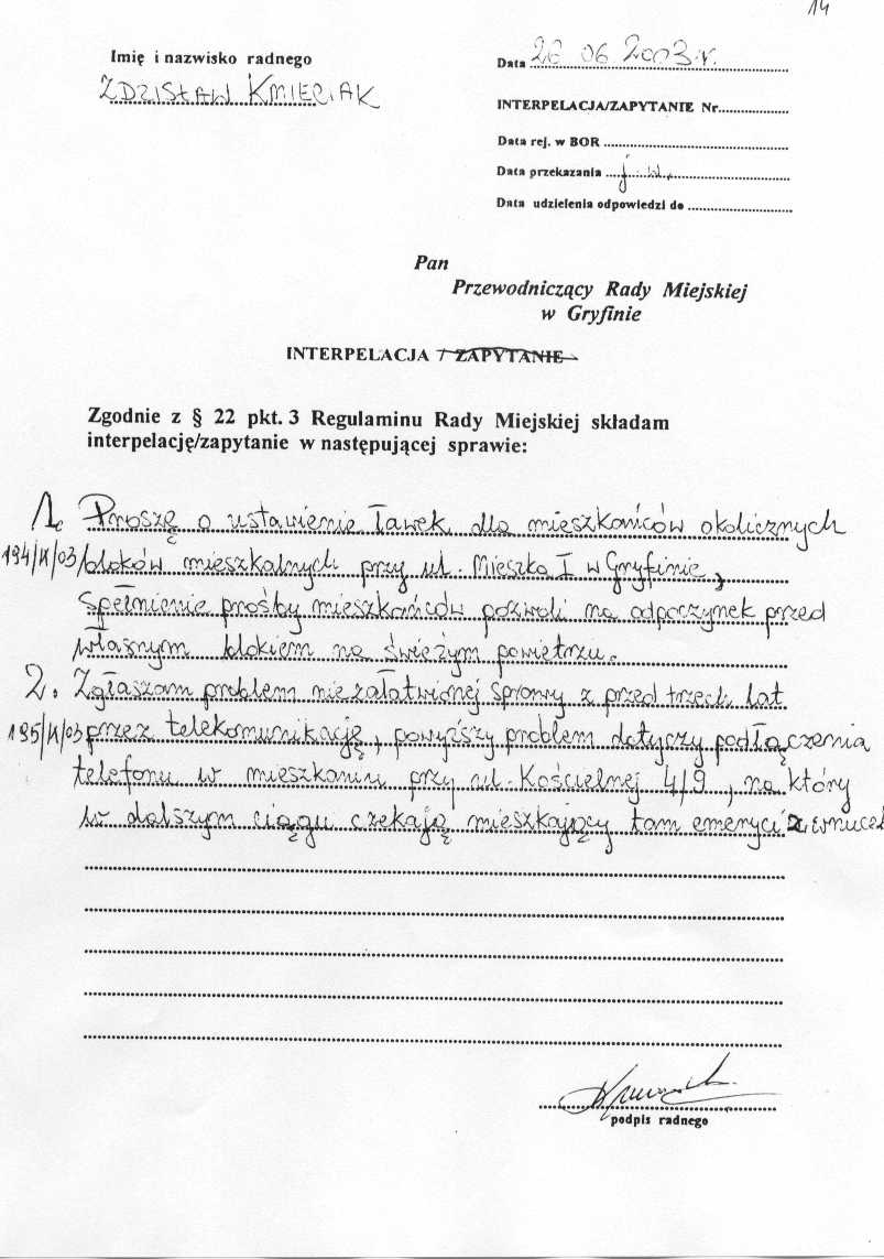 186/IX/03 - podczas przerwy w obradach sesji dowiedziałem się, że w miejscowości Wełtyń w dniu dzisiejszym zostały wymienione wszystkie znaki drogowe. Mieszkańcy Wełtynia nie są zadowoleni z ustawionych znaków drogowych. Uważają, że oznakowanie powinno być w wersji pierwotnej. Należy również w dwóch miejscach na skrzyżowaniach drogi zamontować lustra. Proszę o zajęcie się sprawą. Chciałbym się również dowiedzieć dlaczego wbrew woli mieszkańców zamontowane nowe znaki?