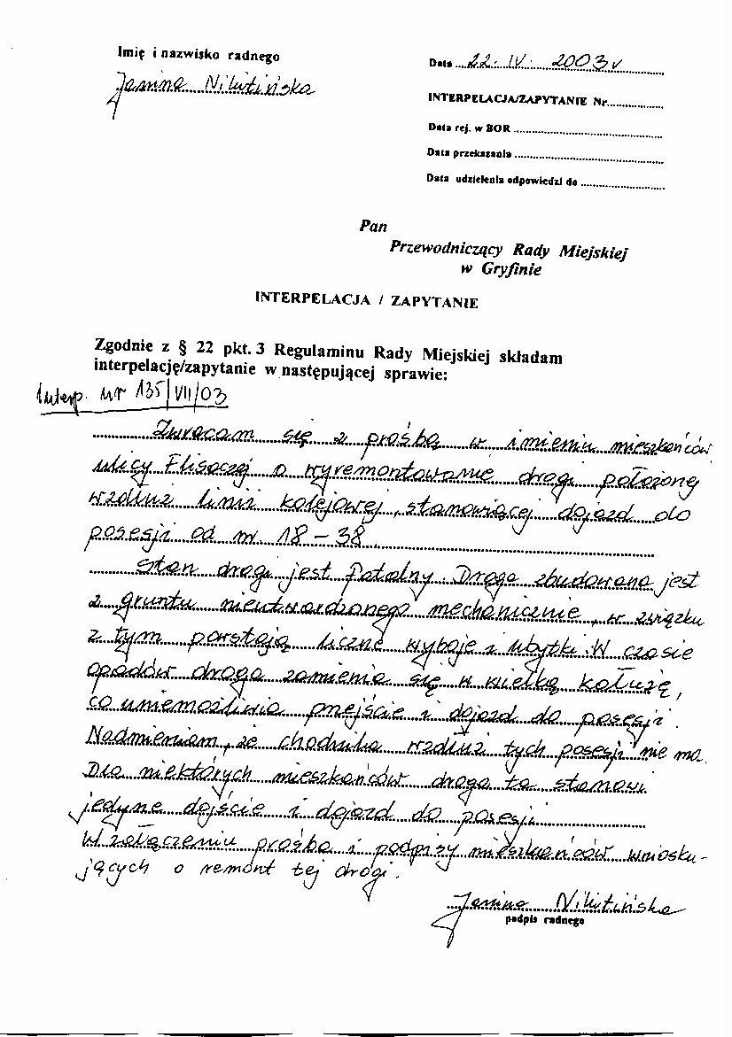 Ad. 128/VII/03 - proszę Prezesa PUK Sp. z o.o. w Gryfinie o zajęcie się sprawami, o których mowa w interpelacjach.
