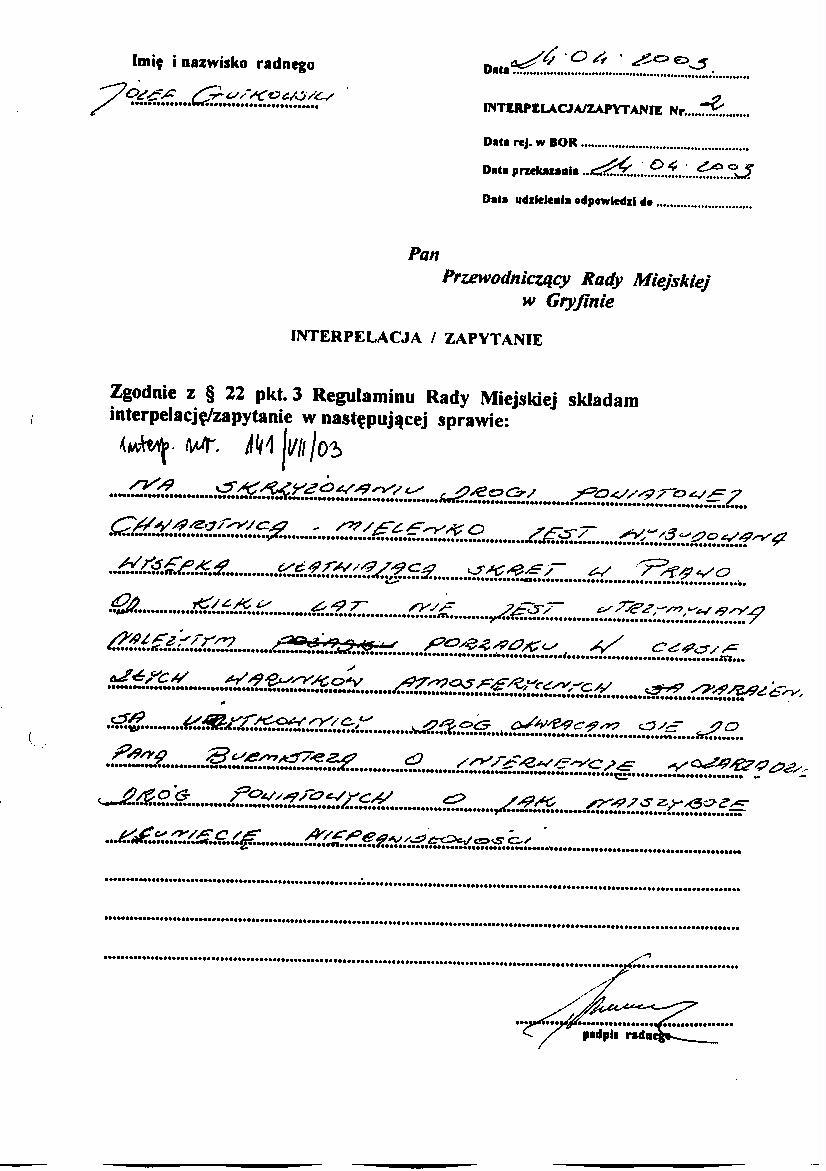 „Wnoszę o ściganie karne Zdzisława Kmieciaka, zamieszkałego w Czepinie 14, gmina Gryfino, radnego Rady Miejskiej w Gryfinie za popełnione przestępstwa z art. 244 kk oraz prawdopodobne popełnienie przestępstwa a art. 286 kk”. - załącznik nr 45. Takie pismo skierowałem do Przewodniczącego Rady Miejskiej. Dysponuję wypisami z akt sadowych, z których wynika, że nie tylko Pan Kmieciak ale również Pan Artur Nycz złamał prawo. Informacje w tej sprawie otrzymałem z Zachodniopomorskiej Wspólnoty Samorządowej. Ponadto wytknięto mi, że nie reaguję na to co pisze się w prasie na temat Gryfina. Jestem mile zaskoczony przebiegiem dzisiejszej sesji, z którego wynika, że w tym mieście dzieje się wiele i obecna Rada działa skutecznie. Jednak opinia w prasie jest negatywna, a przyczynili się do tego radni.
